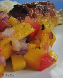 Szeretem ezt az ételt, a sokszínű, nyarat idéző gyümölcsös salsát és az édes-fűszeres csirkecombokat. Hidegen is fogyasztható, a salsa egy nappal korábban is elkészíthető.