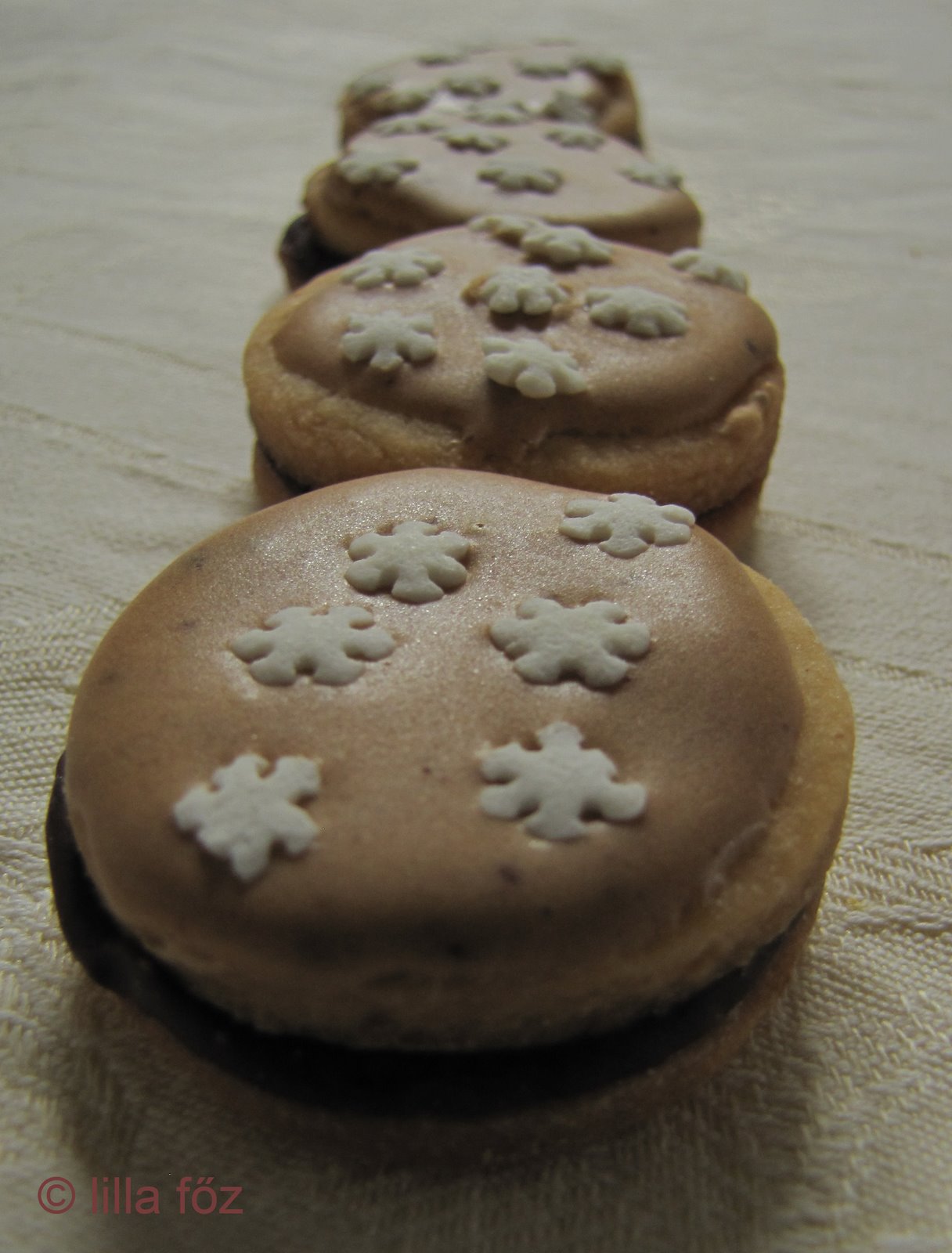 Ha kihűltek összeragasztom őket a krémmel, elég sok a krém, bőven lehet közéjük kenni. Kicsit felpúposodnak a korongok, ez ebben az esetben jól jön, mert sok krém fér közéjük.