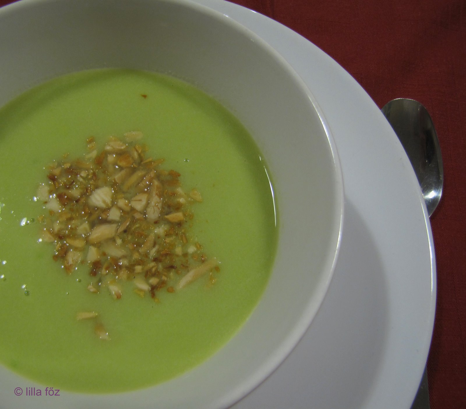 A húslevest összeforralom a tejszínnel. Amikor felforr beleteszem az átnyomott fokhagymát és pár percig forralom. Kikapcsolom a tűzhelyet és hagyom pár percig hűlni. Egy serpenyőben szárazon megpirítom a mandulát. Az avokádó belseejét kikaparom, a citromlével és kevés levessel összeturmixolom. Az avokádókrémet elkeverem a meleg levesben, csészékbe szedem és a mandulával megszórva tálalom.