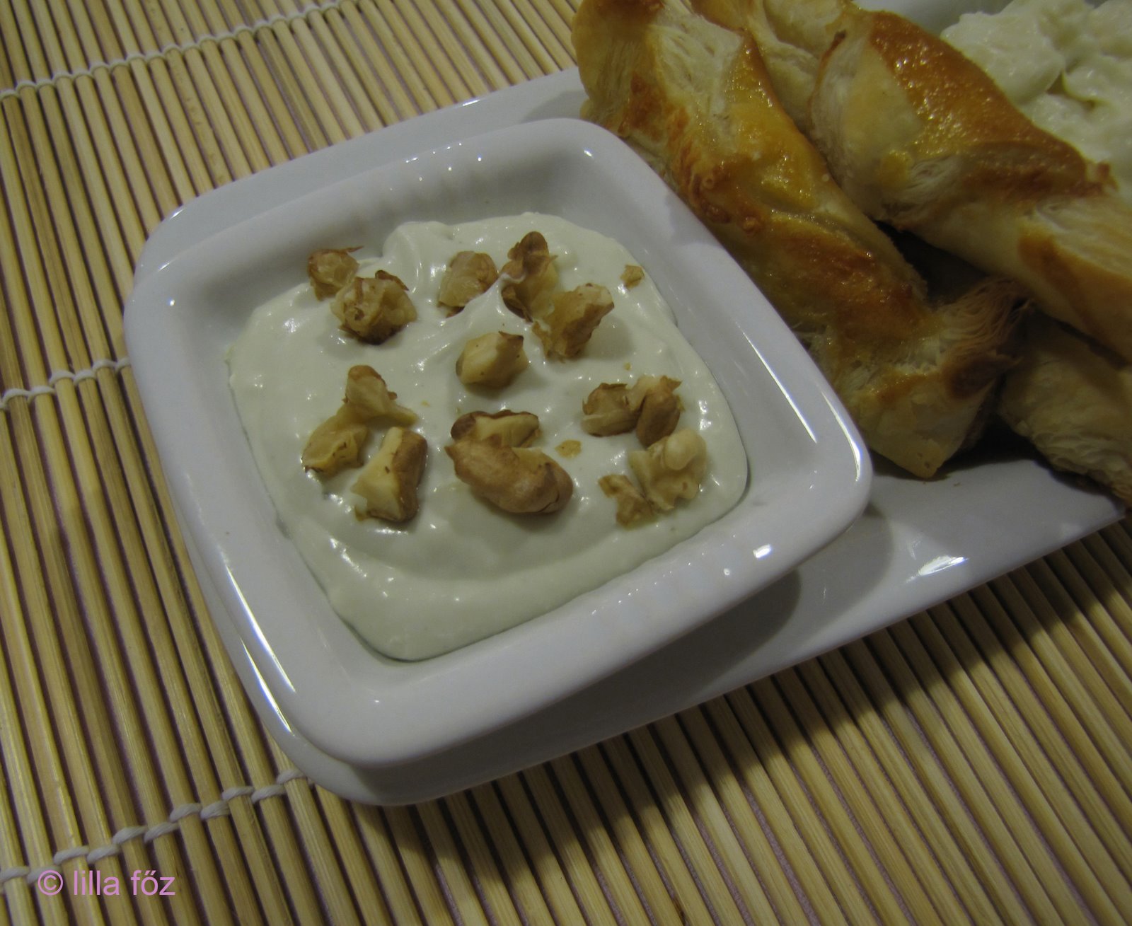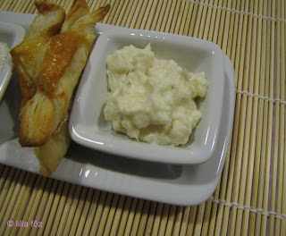 A levelestésztát kinyújtom, megkenem a felvert tojással, kicsit megsózom és megszórom reszelt sajttal. Háromszögekre vágom, feltekerem és előmelegített sütőben 200 fokon megsütöm. A mártogatókhoz a sajtot villával szétnyomom, és annyi tejszínt és tejszínes krémsajtot keverek bele, hogy lágy kenhetű állagú legyen.