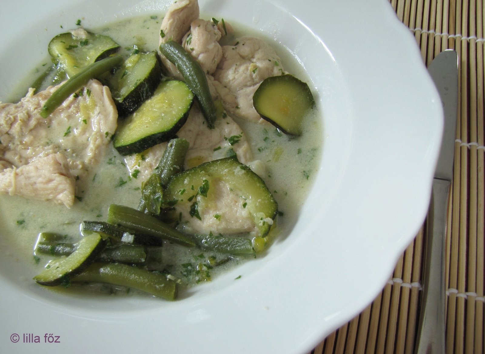 A húst szeletekre vágom. A cukkinit 3mm vastagra szeletelem, felkarikázom az újhagymát. Az olajon kifehérítem a húst. Hozzáadom a fokhagymát, az újhagymát és a curryt. További 1 percig pirítom. Felöntöm a kókusztejjel, és öt percig főzöm lefedve. Ekkor hozzáadom a cukkinit és a zöldbabot, és készre főzöm (kb 10 perc). Miután megfőtt, sózom, borsozom, belenyomom a fél citrom levét, és megszórom petrezselyemzölddel. Főtt rizzsel tálalom.