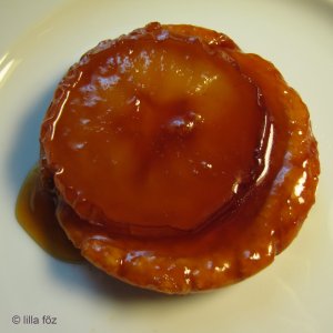 Elkeverem a lisztet egy csipet sóval, kevés fahéjjal és 4 dkg cukorral. Összemorzsolom a margarinnal, hozzáadom az 1 evőkanál citromlével elkevert tojássárgáját, és összegyúrom. Fél órára beteszema hűtőbe. 15 dkg cukrot a maradék teáskanál citromlével karamellizálni kezdek. Amikor a karamell eléggé megpirult hozzáadok 1-1,25 dl forrásban lévő vizet. Addig forralom, hogy az összes karamell elolvadjon a vízben. Öt felfújtas edénykét kikenek margarinnal, az aljukban elosztom a karamellt. Mindegyikre 1 karika almát teszek. Aki fahéjasan szereti annak szórok rá fahéjat, aki nem laktóz-intolarens az néhány vajszeletkét is kap. A tésztát ötfelé osztom, golyókat formálok. A golyókat akkorára lapítom, mint az edénykék, és beterítem tésztával az almákat (jól lenyomkodom a tésztát). Előmelegített sütőben 180 fokon 25-30 percet sütöm. Kicsit hülni hagyom és tányérra borítoma tortácskákat. Langyosan tálalom.