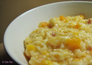 Ez a többiek kedvenc rizottója. Én a sárgarépás-zelleres verziót is szeretem, nem döntöttem el, hogy melyiket jobban. Talán mindig azt, amelyik éppen van. A húsos szalonna – sütőtök nagyon jó párosítás, leves, tészta, rizottó, bármi jöhet.