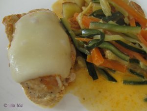 A sárgarépát és a cukkinit megmosom, meghámozom, és vékony csíkokra vágom. A csirkemellfilé mindkét oldalát sózom, borsozom. Az olajat egy nagy serpenyőben felhevítem, és oldalanként 5-5 percig sütöm benne a húsdarabokat, majd kiveszem és félrerakom. Az apróra vágott fokhagymát a visszamaradt olajban megpirítom. Hozzáadoma zöldségeket és 5 percig kevergetve párolom. A provance-i fűszerkeveréket, a pirospaprikát, sót, borsot és a keményítőt elkeverem a tejszínben, a zöldséghez öntöm, és felforralom. A húst visszateszema zöldség tetejére és lefedve 10 percig párolom. Miután letelt a 10 perc, minden darabra egy szelet sajtot teszek, és miután megolvadt, tálalom.