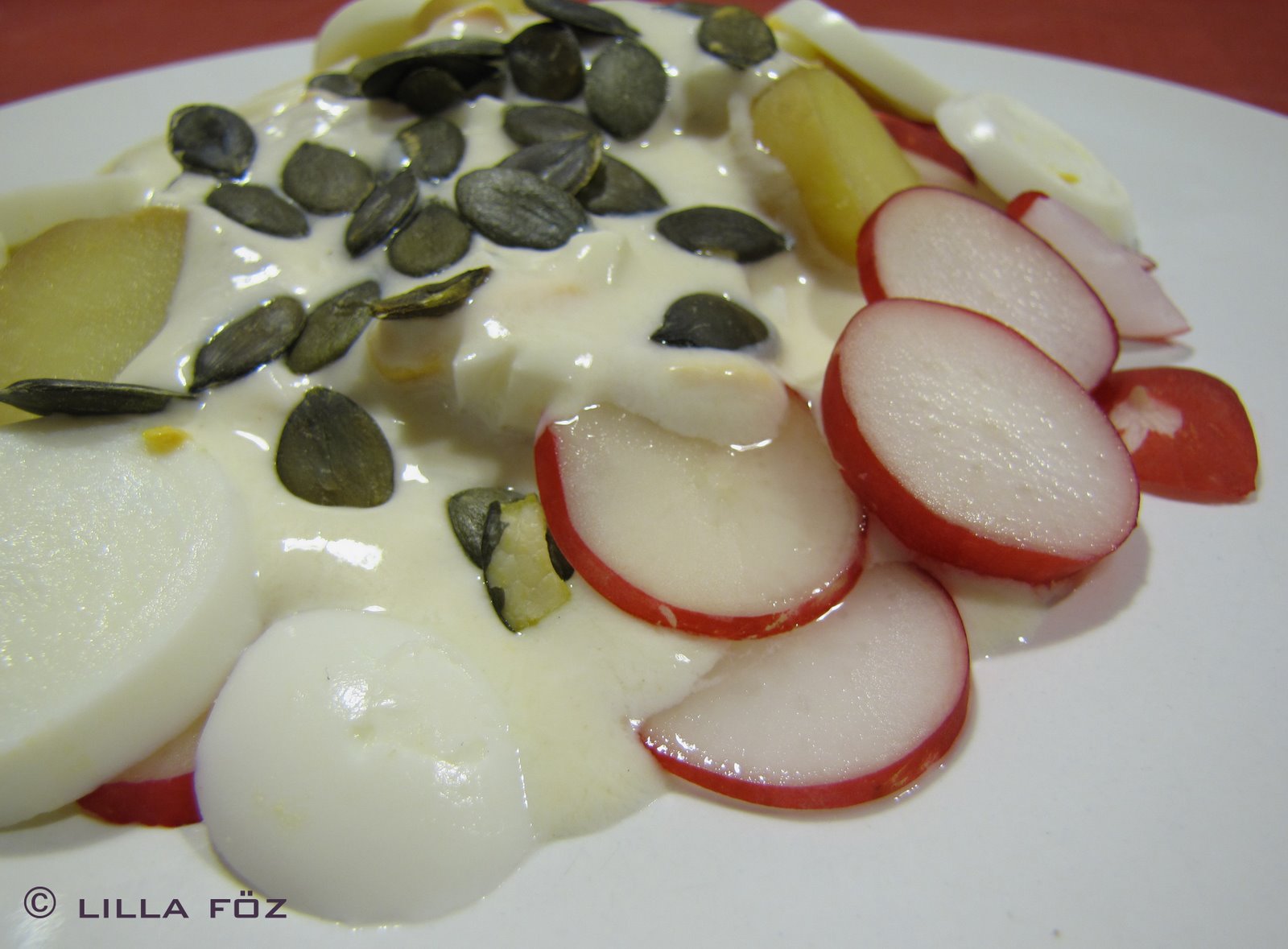 A krumplit alaposan megmosom, héjában megfőzöm, és még melegen meghámozom. A tojásokat keményre főzöm, és hagyom kihűlni. A kihűlt tojást megpucolom és 4-et felkarikázok. Cikkekre/karikákra vágom a krumplit. A retket megmosom és felvágom (cikkekre, karikára, kinek hogy tetszik). A joghurtot elkeverem a mustárral, a majonézzel, és a zúzott fokhagymával. Sózom, borsozom. Előveszek 4 tányért, elosztom rajta a krumplikarikákat, mindegyikre egy összevágott tojást és két retket teszek. Rácsurgatom az öntetet, és bőségesen megszórom tökmaggal. Aki szereti tehet rá snidlinget/újhagymát.