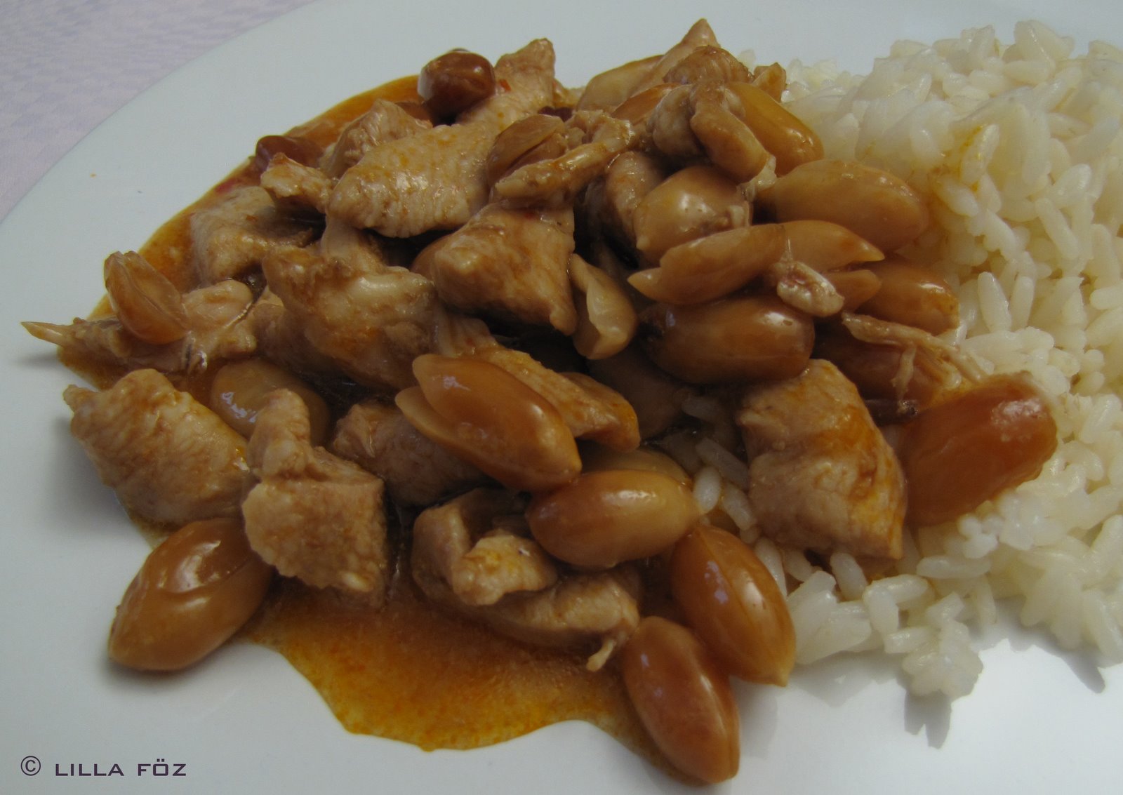 A csirkehúst kis kockákra/csíkokra vágom. Összekeverem az olajat, a szójaszószt, a zúzott fokhagymát és a paprikakrémet. Beleteszem a csirkehúst min. 20-30 percre. Közben néhányszor átkeverem, hogy mindenhova jussona  pácból. A mogyorót megtisztítom, leszedem a barna vékony zizgős héját is. Egy nagy serpenyőt (wokot) felmelegítek. Beleöntöm a csirkét és folytonos keverés közben nagy lángon átpirítom. hozzáadom a mogyorót, azzal is pár percig pirítom. A keményítőt elkeverem egy fél deci vízzel, a húsra öntöm, és 3-4 perc alatt készre főzöm. Megkóstolom, ha szükséges megsózom (általában nem kell megsózni, mert a paprikakrém és a szójaszósz is nagyon sós). Főtt rizzsel tálalom.