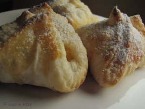A pudingot megfőzöm a tejjel és a 4 evőkanálnyi cukorral. Hagyom kihűlni. A sütőt előmelegítem 200 fokra. Lisztezett deszkán vékonyra (2-3 mm szerintem) nyújtom a levelestésztát. Kb. 7-8 cm-es négyzetekre vágom, mindegyik közepére teszek egy kanálnyi pudingot. Felhajtom a négyzet négy sarkát és átszúrom egy fogpiszkálóval. Tepsibe teszem, és megkenem a felvert tojással. 10-12 percet sült szerintem, de látszik a színén, hogy mikor jó…. Még forrón kihúzgálom a fogpiszkálókat és megszórom porcukorral.