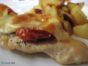 A paradicsom olajából pár kanálnyit egy serpenyőbe öntök és felhevítem. Pár perc alatt megsütöm a húsok mindkét oldalát, és egy tepsibe teszem őket. A húsokat megsózom kicsit, megszórom bazsalikommal, a tetejére 1-2 aszalt paradicsomot és egy szelet sajtot teszek. Előmelegített sütőben 220 fokon addig grillezem, amig a sajt megolvad. Sütőben ropogósra sült krumplival tálaltam.