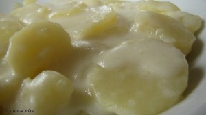 A zöldségeket megtisztítom, a hagymát lereszelem és a krumplit kb 4 mm-es karikákra vágom. Az olajat felhevítem és átforgatom benne a hagymát. Hozzáadom a krumplit és 2-3 percig együtt pirítom. Felöntöm annyi vízzel, hogy majdnem teljesen ellepje. Sózom, borsozom, beleteszem a babérleveleket. Miután megfőtt, habarást készítek a lisztből és 1-1 dl tejből és telfölből. Ha szükséges adok hozzá még tejet. Egy kiskanál ecettel (5%-s almaecet pl) savanyítom.