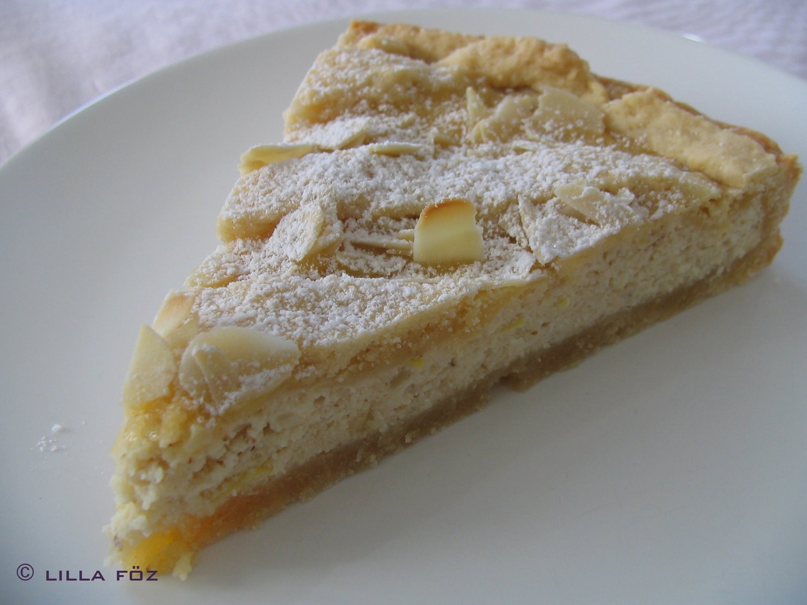 Egy kapcsos tortaformát (24 cm-esnél ne legyen nagyobb) kikenek vajjal/margarinnal. A tésztát 2-3 mm vastagra nyújtom, kibélelem vele a formát (legyen pereme is), megszurkálom egy villával az alját. Megtöltöm a ricottás töltelékkel. A maradék tésztát 1 cm széles csíkokra vágom, díszítem vele a tortát és megszórom a lapmandulával. 30-40 percig sütöm, hidegen, porcukorral megszórva tálalom.