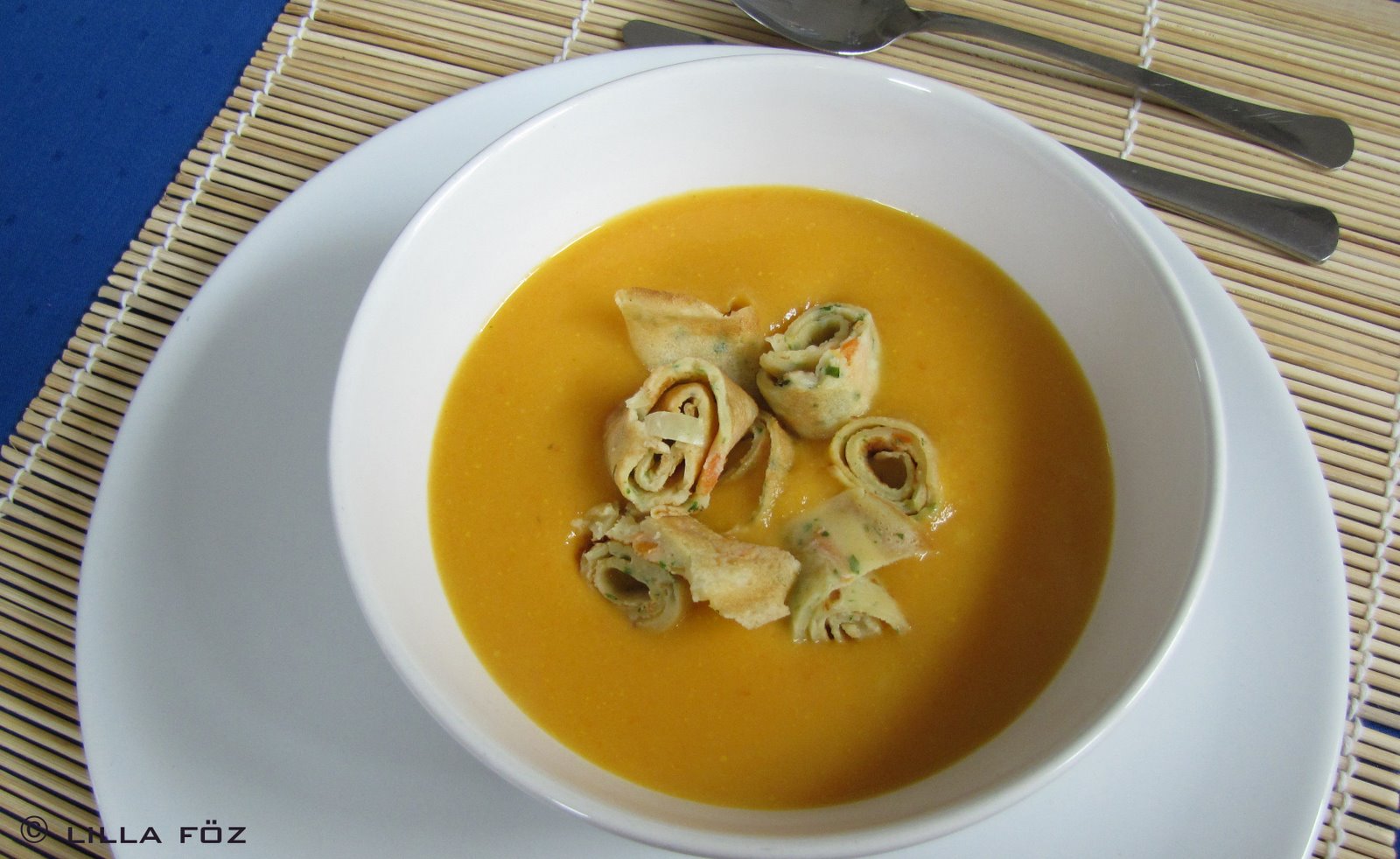 A megtisztított felkarikázott répát átforgatom az olajon, felöntöm a zöldséglevessel és megfőzöm. Kicsit hűlni hagyom, majd összeturmixolom. Hozzáöntöm a tejet (ha nem lenne elég sűrű a leves akkor egy kis liszttel vagy keményítővel elkeverve), sózom, borsozom és felforralom. A tojásokat, az olajat, a tejet és a lisztet a turmixszal elkeverem, annyi szénsavas vizet adok hozzá hogy a szokásosnál sűrűbb palacsintatésztát kapjak. Sózom, borsozom. A sárgarépát nagylyukú reszelőn lereszelem, a hagymát és a petrezselyemzöldet apróra vágom, és mindhármat hozzáadom a tésztához. Kis serpenyőben megsütöm a palacsintákat. Ha kihűltek, feltekerem és csíkokra vágom. A palacsintametéltet külön tálkában kínálom a leveshez.