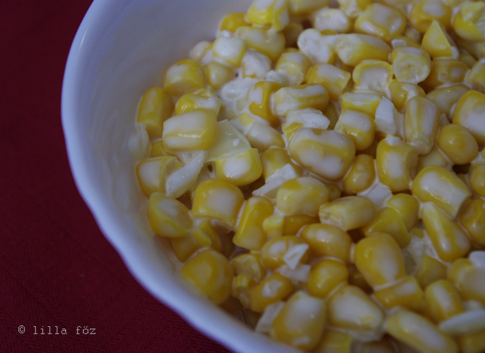 A kukoricát megfőzöm, leszűröm és félreteszem hűlni. A hagymát apróra vágom. Egy tálban elkeverem a majonézt a hagymával, kevés sóval és borssal (vagy nem is teszek egyáltalán borsot). Hozzáteszek kb. 2 dl tejfölt és egy teáskanálnyi mustárt. Ha kihűlt a kukorica, belekeverem. Ha nincs elég öntet rajta, akkor először tejföllel, majd majonézzel szaporítom. Megkóstolom, és ha szükséges megsózom. Minimális mennyiségű öntetet szoktam készíteni, részben diétás megfontolásból, részben azért, mert majonézes kukorica a neve, nem pedig kukoricás majonéz.