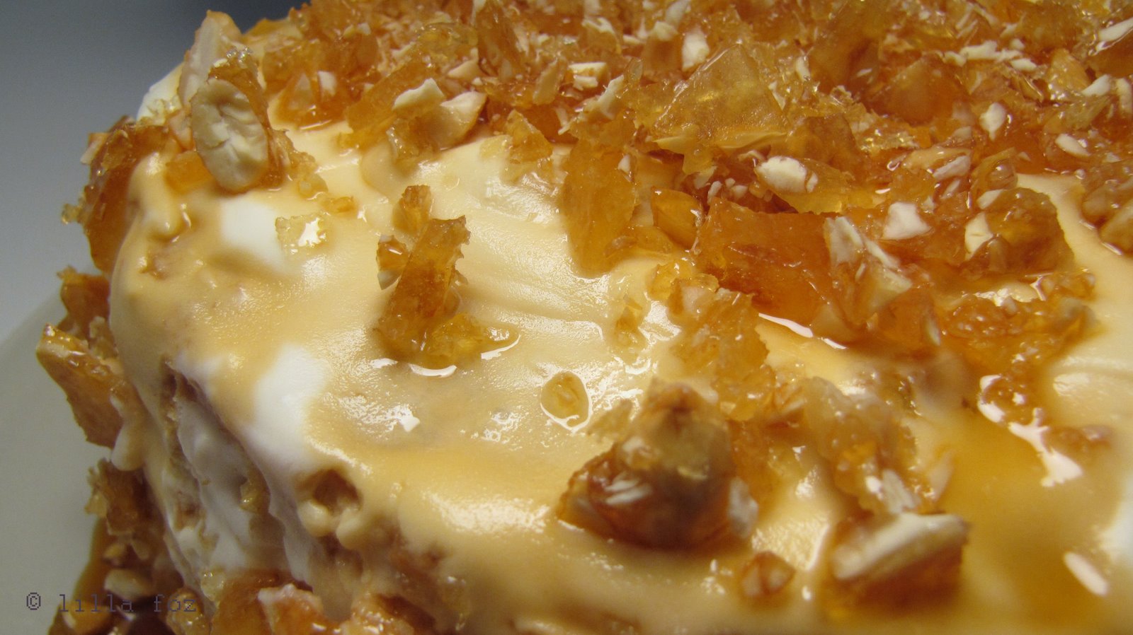 Valami ropogós-krémes tortára vágytam.Úgyhogy összepárosítottam a tejszínes-mascarponés krémet, a ropogós mandulás grillázst és némi folyékony karamellöntet. A végeredmény csodálatos lett. Biztosan lesz ismétlése.