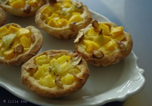 Egyik újabb konyhai “játékom” – kosárforma… Ez az első verzió, már azóta készült egy teljesen másféle is, majd posztolom azt is. Ez amolyan klasszikus: omlós tészta, túrókrém, egzotikus gyümölcsök… Kis (kb 35 ml-es) formákkal 48 darab, muffintepsiben (vagy 70 ml-es formákkal) 24 darab lesz ebből az adagból. Nekem a mangó és az ananász nem volt elég, kellett hozzá egy kis kivi, hogy mindegyikre jusson elég gyümölcs. A kisebb formák jobban beváltak, mint a nagyobb, 70 ml-es, muffinméretűek.