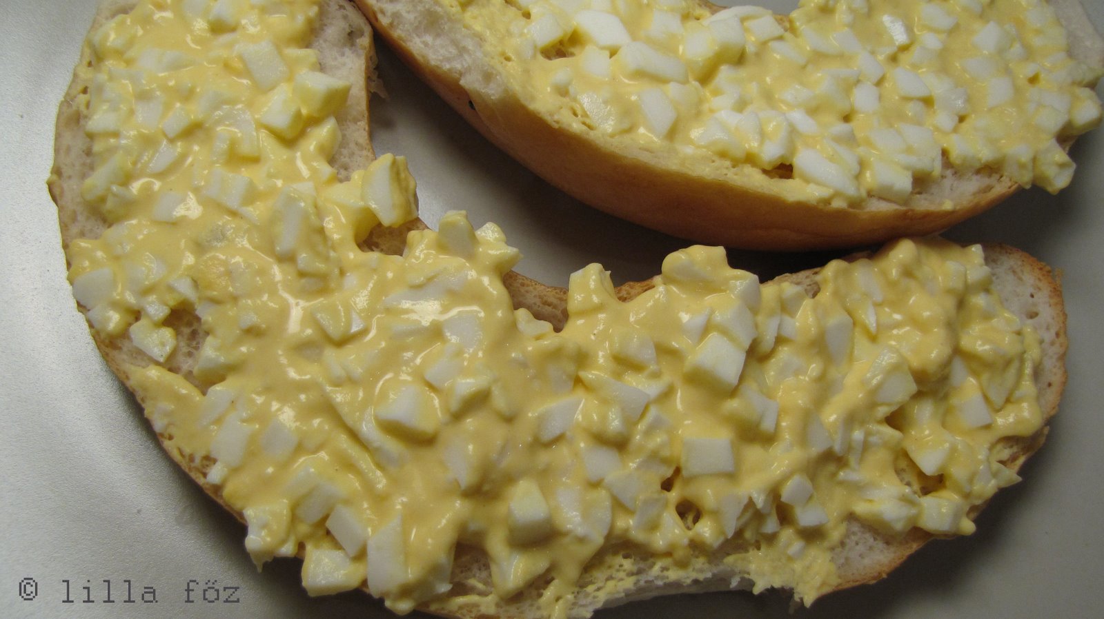 A tojásokat megfőzöm, miután kihűltek, megpucolom. A sárgájákat egy tálba teszem, villával összetöröm. Kevés majonézt, tejfölt, és még kevesebb mustárt keverek hozzá. A fehérjét apróra vágom, és elkeverem a tojáskrémben. Sózom, (borsozom).