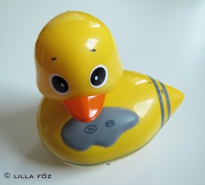 A kacsa egy fm/am rádió, elvileg úszik a vízen – mi nem kockáztattunk, úgyhogy csak a polcon csücsül. A fejét előre forgatva kapcsol be. A dobozka pedig pontosan az, aminek látszik, fültisztító-tartó.