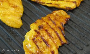 Az egyik legújabb konyhai „játékom” egy grillserpenyő. Ezt akartam mindenképpen kipróbálni, valami egyszerű, mézes-fűszeres hússal. Jelesre vizsgázott, gyorsan megsültek a hússzeletek, és a mézes pác nem égett rá a bevonatra. Úgyhogy most mindent csíkosra sütök, amit csak lehet.