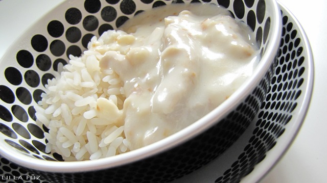 Kb. két evőkanálnyi olajat felhevítek egy teflon serpenyőben, átpirítom rajta a húst, miután minden oldalukon kifehéredtek, kevés fehérbort öntök alá, és pár percig párlom. Megszórom 1 evőkanálnyi liszttel, átforgatom, majd felöntöm 2 dl tejjel. Belekeverem a reszelt sajtot, sózom, borsozom, és egyet forralok rajta. Ha nagyon besűrűsödik a mártás, öntök bele még egy kis tejet. Főtt rizzsel tálalom.