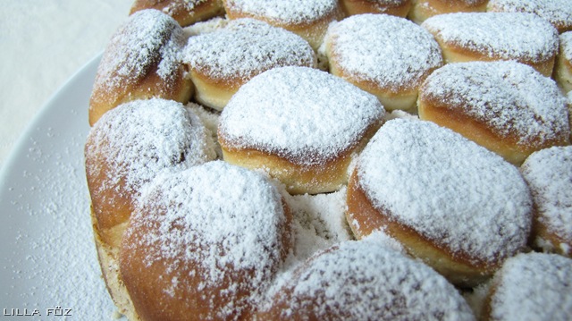 A élesztőt felfuttatom a langyos cukros tejben. A liszthez adom a tojássárgáját, az olajat és az élesztős tejet, rugalmas tésztát dagasztok belőle, és meleg helyen kétszeresére kelesztem (akinek van kenyérsütőgépe, azt ezt kicsit egyszerűbben meg tudja oldani). Kb. 7 mm vastagra nyújtom a tésztát, pogácsaszaggatóval korongokat szúrok ki belőle. Az alsó sorhoz a korongokat megkenem olvasztott vajjal, kirakom a kapcsos tortaforma alját velük, és megszórom cukrozott dióval. A középső sorhoz a korongokat megkenem olvasztott vajjal, és a cukrozott dióba hempergetem. Miután megvan ez a sor, szórok rá még egy kis diót. A legfelső sort csak olvasztott vajjal kenem meg. Langyos sütőben 180 fokon megsütöm (nekem légkeveréssel nagyon gyorsan megsült a teteje, elég hamar át kellett váltani alsó sütésre, lehet h érdemes alsóval csinálni végig). Vanília/bor/csokisodóval tálalom.