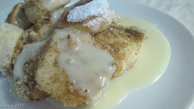 Eltérő, hogy ki melyik részét preferálja az aranygaluskának, van, aki a tetejét, más az alját-szélét, én pedig a közepét szeretem a legjobban. Jó a ropogós teteje is, a pirult dió is finom a széleken. De a legeslegjobb a csupa-dió közepe. Hagyományosan főzött vaníliakrémet adnak mellé, én azonban finnyás vagyok, a főzés végén belekevert tojáshab nekem túl nyers. Úgyhogy a főzős pudingporhoz hasonló vaníliamártást főztem hozzá. Decens módon anyám csokiöntettel szokta általában tálalni.