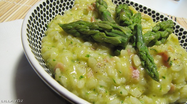 Variációk spárgára: második felvonás (első itt). Ideális azoknak, akik esetleg a spárga állagától irtóznak, és nem az ízétől. A spárga majdnem egésze (vagy akár az összes) összeturmuxolva kerül a rizottóba.