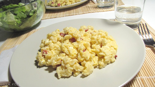 Igazi tavaszi klasszikus friss fejes salátával. Gyorsan elkészül és nagyon egyszerű. Egyetlen hátulütője van: a mosogatás. Két tuti tippet olvastam; az első: hagyjuk rászáradni, és akkor könnyen lejön a nokedli-tészta, kettő: ne meleg, hanem hideg vízzel álljunk neki a mosogatásnak. Most volt némi kolozsvári szalonnám, amihez nem volt semmilyen ötletem, úgyhogy kb. 5-7 dkg-mal felturbóztam a tojásos nokedlit.