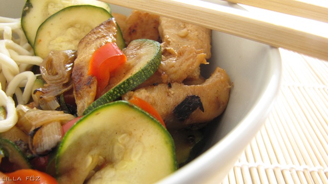 Nagyon nehezen sikerült összehozni ezt az ételt, negyedik vagy ötödik helyen sikerült csak normális kaliforniai paprikát vennem (ott sem sikerült egy zöldet egy pirosat, csak két pirosat, de az akkor már mindegy volt), jobban hasonlítottak mazsolára, mint paprikára olyan ráncosak voltak… Négy személyes adaghoz elkél a wok, mert még a nagy serpenyőben is nehéz volt kavarni. Valamint tovább is kellett kicsit a cukkínivel sütni, mint a receptben előírt egy perc, mire mindenhol kicsit összeesett.