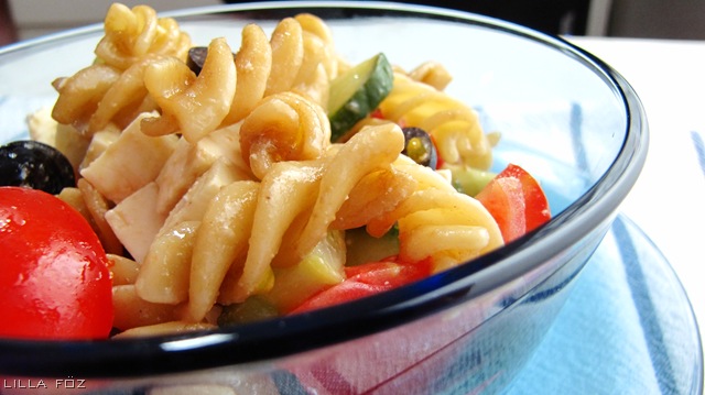 Megkívántam valamilyen hideg tésztasalátát, a lehetőségeket – és, hogy mit kívánok még – végiggondolva arra jutottam, hogy uborkás-paradicsomos-fetás változatot kell készítenem. Azaz „görög” tésztasalátát. Szintén a tésztasaláta mellett szólt az is, hogy este tízkor álltam neki megfőzni a másnapi ebédet, úgyhogy minimális erőfeszítést igénylő ételre volt szükségem.