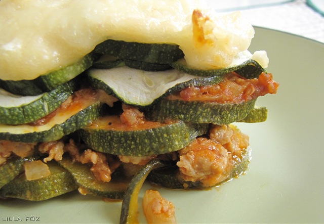 Az apróra vágott hagymát megpárolom az olajon, hozzáadom a darált húst, miután mindenhol kifehéredett, sózom, borsozom, belekeverem a sűrített paradicsomot, és fedő alatt kb. 10 percig párolom. Közben a vajból, lisztből és tejből besamelt főzök. A kész besamelt kicsit megsózom, szerecsendióval fűszerezem, és egy maréknyi reszelt sajtot keverek bele. A cukkíniket felkarikázom (2-3 mm vastagra). Egy tűzálló tálban összeállítom: Egy réteg cukkíni – a darált húsos ragu fele – egy réteg cukkíni – a darált húsos ragu második fele – a maradék cukkíni – besamel – reszelt sajt. Előmelegített sütőben 180-200 fokon addig sütöm, amíg a sajt megpirul a tetején.