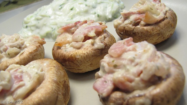 A gombákat megtisztítom, a kiszedett tönköket összevágom. A bacont felvágom, és megsütöm. A krémsajtot elkeverem az átnyomott fokhagymával, a felaprított gombával és a baconnel. A gombák kalapjába kanalazom a tölteléket és grillserpenyőben közepes hőmérsékleten (9 fokozatból 6-oson) megsütöm. Tzazikivel tálaltam.