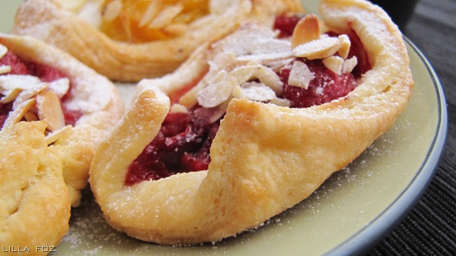 Először elkészítem a kétféle tölteléket, a narancs lényegesen kisebb mennyiség, mint a meggy, mert ennyi meggyem volt, és mind el akartam használni, a narancs afféle próba és kiegészítés volt. Szerintem lehet úgy kétszerezni a mennyiségeket, hogy a tojássárgája marad egy, mert nem lehet annyi pavlovát és habcsókot sütni/enni, mint amennyi tojásfehérje össze tud gyűlni a fagyasztóban. A narancskrémnél a hozzávalókat simára keverem (turmix, ha máshogy nem megy), és pár perc alatt sűrűre főzöm, és félreteszem hűlni. A meggy felét (és a levet, amit engedett), a keményítőt, a cukrot, és a tojássárgáját egy kisebb fazékba teszem, és összeturmixolom, ezt is sűrűre főzöm, és a végén belekeverem a maradék meggyet. A sütőt 200 fokra előmelegítem, és a tésztát lisztezett deszkán 3 mm vastagra nyújtom. Kb. 8×10 cm-es téglalapokra vágom, a téglalapokat átteszem egy sütőpapírral kibélelt tepsibe, a közepükre egy kis tölteléket teszek, a rövidebbik oldalon összenyomom a tészta sarkait, megkenem a felvert tojással, és a közepébe mandulát szórok. 200 fokon 20 perc alatt megsütöm. Miután kihűlt, megszórom porcukorral.