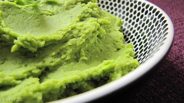 A borsót annyi vízben, ami éppen ellepi, felteszem főni. Miután megfőtt, leszűröm, de a főzővíz egy részét félreteszem. A borsót összeturmixolom, adok hozzá egy keveset a főzővízből, hogy kellően krémes legyen. Sóval, apróra vágott petrezselyemmel/mentával, és egy kevés reszelt parmezánnal ízesítem. Végül egy-két diónyi vajat keverek bele.