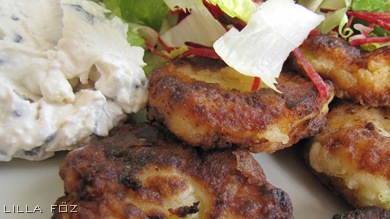 A burgonyát megmosom, és héjában 25 perc alatt megfőzöm. Forrón meghámozom, és áttöröm. Hozzákeverem a felvert tojást, a vékonyan felkarikázott újhagymát, a feta sajt felét elmorzsolva és a citromlevet. Sóval, borssal, kakukkfűvel ízesítem, és lefedve 1 órán át pihentetem a hűtőben. A masszából diónyi gombócokat formálok, ellapogatom, és lisztbe forgatom. Egy serpenyőben annyi olajat melegítek, hogy befedje az alját, és pár perc alatt mindkét oldalukon megsütöm a burgonya-fasírtokat. Közben villával összetöröm a maradék fetát, és kevés tejszínnel és tejföllel hígítom, majd belekeverem az apróra vágott olajbogyót. A burgonya-fasírtokat a mártogatóval és salátával tálalom.