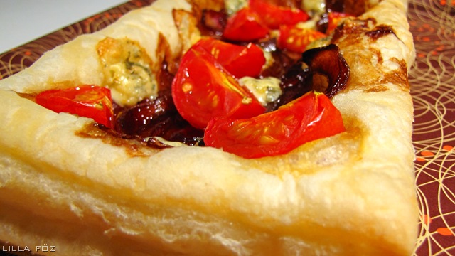 A sütőt előmelegítem 200 fokra (légkeverés), és 2 tepsit kibélelek sütőpapírral. A hagymát megpucolom, és cikkekre vágom. Egy teflon serpenyőben felhevítem az olajat, és átforgatom rajta a hagymát. Miután mindenhol üvegesre párolódott, hozzáadom a cukrot, és a balzsamecetet, és nagy lángon addig kevergetem, amíg a leve besűrűsödik, és minden hagymát karamellréteg von be. A leveles tésztát 2 mm vastagra nyújtom, és 6 darab téglalapot vágok belőle. A tésztalapokat tepsibe teszem, egyenletesen eloszlatom rajtuk a karamellizált hagymát, mindegyiket megszórom 2-2 cikkekre vágott koktélparadicsommal és morzsolt kéksajttal. Kicsit megsózom, és kb. 15 perc alatt készre sütöm. Forrón tálalom.