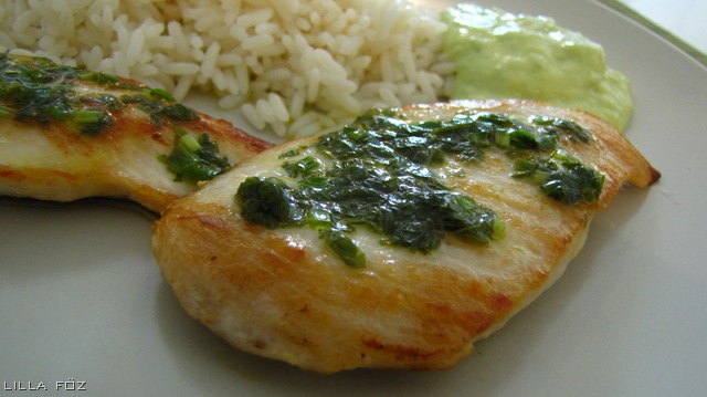 A csirkemellet szeletekre vágom, és kevés olajon (vagy grillen) megsütöm. Nem sózom meg, csak tálaláskor, így nem enged ki magából annyi levet, és valóban sülni fog, nem pedig párolódni. A zöldfűszeres mártás hozzávalóit összekeverem. Az avokádó húsát kikanalazom, a túróval és a citromlével összeturmixolom, és kicsit megsózom. A hússzeletek tetejére kanalazom a zöldfűszeres mártást, és rizzsel valamint az avokádós dippel tálalom.