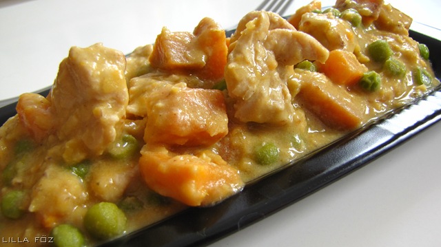 Soha nem ettem ezelőtt édesburgonyát, nem rossz, kár, hogy kevés helyen és drágán árulják. Ha valaki nem tud vagy nem szeretne édesburgonyát venni, próbálja ki nyugodtan sütőtökkel ez a curryt, mert az édesburgonya színre és ízre is eléggé hasonlít rá. Nyugodtan kísérletezhetünk a többi hozzávalóval is a curry egy meglehetősen tágan értelmezhető étel, borsó helyett brokkolival is készíthető, a narancssárga alap mellett jól mutat a zöld.