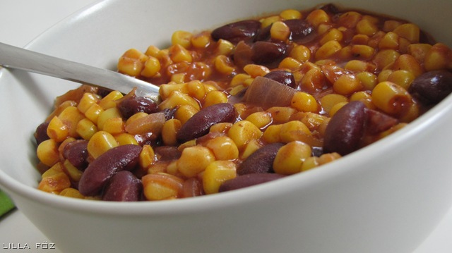 Ha nincs időm semmi komolyat főzni, akkor szokott előkerülni ez a kukoricás babfőzelék, mert hagyma, sűrített paradicsom, bab- és kukoricakonzerv mindig van itthon. Tíz percen belül elkészül, és mégiscsak igazi étel, nem pedig „vízzel összekeverem a port és kész”. Lehet mellé kolbászt vagy tojást sütni, mi csak magában friss kenyérrel szoktuk enni.