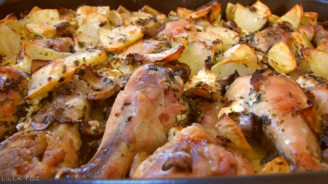 Nagyon egyszerű étel, mindent bele kell tenni a tepsibe, és várni, amíg megsül. Én csak csirke alsócombokat használtam, de lehet egész combokból, vagy akár négybe vágott csirkéből is készíteni, nagyobb darabok setén tovább kell lefedve puhítani. Csak a húst sózom meg a sütés előtt, a burgonyát csak tálalás után, ki-ki a saját tányérján, mert sokkal jobb lesz a burgonya, ha só nélkül sül.