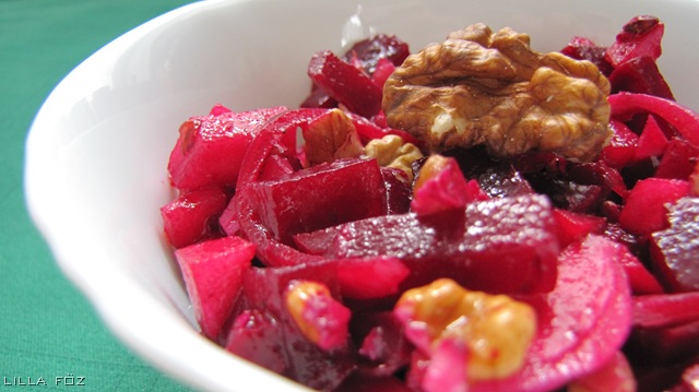 Az ősz kezdetének egyik jele a piacokat elárasztó cékla. Nagyon sokféleképpen elkészíthető, nem a bolti savanyúság az egyetlen (és végképp a legjobb) felhasználási módja. Nagyobb adagot is lehet a salátából készíteni, mert hűtőben legalább 3 napig eláll.