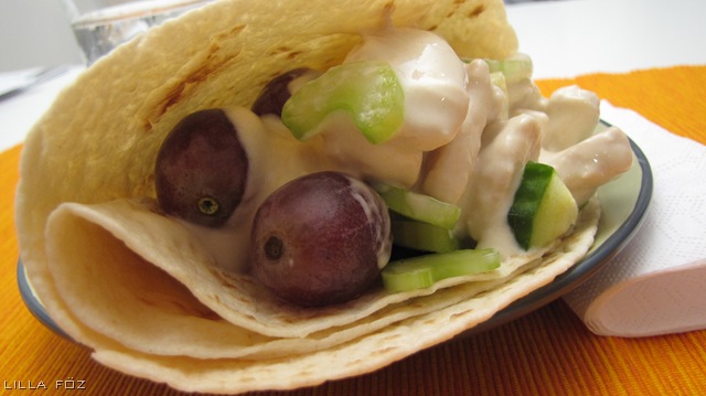 A csirkehúst falatnyi kockákra vágom, és az olajon pár perc alatt pirosra sütöm. A joghurtot összekeverem a mustárral, beleforgatom a megsült húst, és kicsit megsózom. Az uborkát 7-8 mm vastag karikákra vágom, és a karikákat elnegyedelem, a zellert felszeletelem. Az uborkát összekeverem a salátával, a zellerrel és a szőlőszemekkel. A tortilla-lapokat kicsit megmelegítem a mikróban. Két lehetőség van az összeállításra: az első esetben kiterítjük magunk elé a tortillát, teszünk a közepére egy nagy maroknyi salátát, és téglalap alakúra igazítjuk, rákanalazzuk a hús hatodát, a téglalap egyik rövidebbik oldalánál behajtjuk a tésztát, majd ráhajtjuk a két hosszabbik oldalon túlnyúló részeket. Ez a török-görög büfékben kapható „gyros pitában” alakjával egyezik meg. A másik lehetőség, hogy a torilla-lapot félbe, majd még egyszer félbehajtjuk, és a 4 rétegű batyu egyik zsebébe halmozzuk a salátát és a húst (1 illetve 3 lap van ekkor a zseb két oldalán).