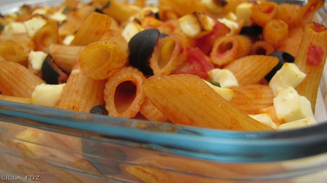 A tésztát megfőzöm, és a főzési idő vége felé bekapcsolom a sütőt 200 fokra. Az olajbogyót karikákra vágom, a fetát felkockázom. A lecsöpögtetett tésztát összekeverem az olajjal, a paradicsommal, az olajbogyóval, és a feta felével. Sózni nem kell, mert a sajt elég sós. Tepsibe vagy tűzálló tálba teszem, elosztom a tetején a maradék sajtot és kb. 15 percre a sütőbe teszem. Azonnal tálalom.