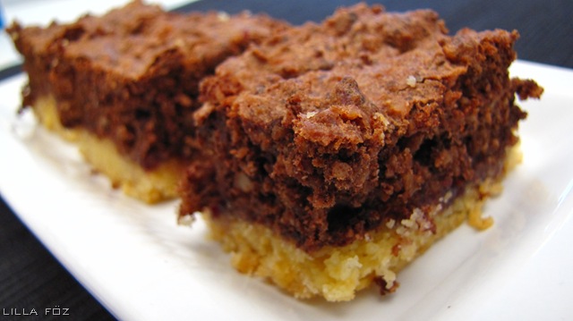 A lisztet elmorzsolom a vajjal, majd hozzáadom a cukrot és a sütőport, és gyorsan összegyúrom. Fóliába csomagolom, és fél órára a hűtőbe teszem. Közben ledarálom a diót/mogyorót és a csokoládét. A csokoládé reszelése nem valami nagy móka, sőt, a kézi reszelőt egyáltalán nem javaslom, nekem a diódaráló vált be eddig legjobban, szigorúan csokoládé-dió sorrenddel. A két hozzávalót nyugodtan darálhatjuk egy tálba is, egyszerre fognak kelleni. A tojásfehérjéket felverem a cukorral, kemény fényes massza legyen, mint a habcsók. A sütőt előmelegítem 170 fokra, és előveszek egy közepes tepsit, vagy sütőtálat. A tésztát kinyújtom és kibélelem vele a tepsit (és csak bele szoktam nyomkodni), megkenem a lekvárral, és a tetejére kanalazom a csokoládés tojáshabot. Kb. 50 percig sütöm, és csak akkor szeletelem fel, ha teljesen kihűlt.