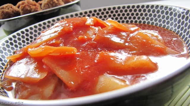 Szerintem igazi őszi főzelék (és menza-kaja) a paradicsomos káposzta. Nem hiszem, hogy túl sokat lehet trükközni az elkészítésével, az egyetlen, amiben némi mozgástér van, a paradicsom: házi, bolti 100%-os dobozos, olasz darabolt paradicsomkonzerv vagy sűrített paradicsom vízzel hígítva. Én a literes 100%-os paradicsomlevet választottam, ez volt a legszimpatikusabb a lehetőségek közül. Csak olyat találtam, ami egy kicsi zellerrel volt ízesítve, de a kész főzeléken egyáltalán nem lehetett érezni a zellert.