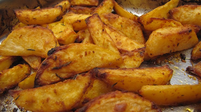 Itt a tél. Most már hivatalosan is. Eljött az esti sütőben sütések ideje – sütőtök, gesztenye, és a burgonya mindenféle fajtája. Ha szép burgonyát tudunk vásárolni, lehet ezt héjastul is sütni, csak nekem burgonyahéj-fóbiám van, a héjában sült burgonyáról is eltávolítom az utolsó héj-molekulákat is, ezért én meghámoztam őket sütés előtt.