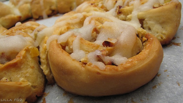 Ez már kicsit karácsonyi hangulatú sütemény, kandírozott gyümölcs, mogyoró, citromos cukormáz… Látványos, és könnyen elkészíthető, szerintem arra is alkalmas, hogy „villogjunk” vele a rokonok/ismerősök előtt. És nem maradt ki a cukor a tésztából, tényleg nem kell bele, így is megkel és így is elég édes lesz.