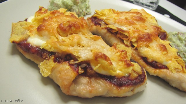 A húst lisztbe forgatom, és kevés olajon elősütöm (oldalanként pár perc). Közben a sütőt előmelegítem 180 fokra (légkeverés), és előveszek egy teflon tepsit, vagy egy sima tepsit kibélelek sütőpapírral. A sűrített paradicsomba keverem a zöldfűszereket és a zúzott fokhagymagerezdeket, és egy kicsit megsózom. A hússzeleteket a tepsibe teszem, megkenem a tetejüket a paradicsomszósszal, és mindegyiken elkenek egy evőkanál tejfölt. A chipset egy zacskóba teszem, és pár roppantással összetöröm (nem kell sodrófával és hasonlókkal csapkodni, párszor a markommal megroppantom és kész). Először a chipsszel, majd a sajttal szórom meg a húst, és 15-20 perc alatt készre sütöm. Forrón, guacamoleval tálalom.