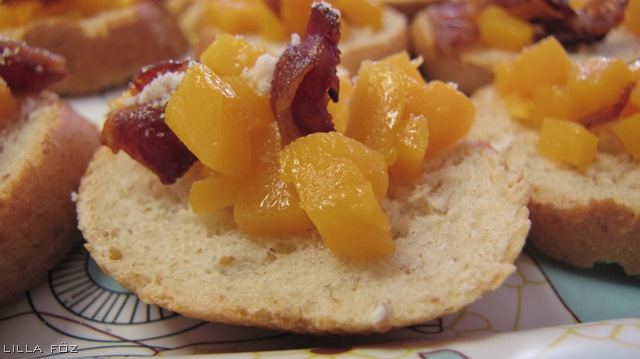 Téli előétel vagy koktél mellé falatka. Ismét Gordon Ramsaytől van a recept, elégedett vagyok az új szakácskönyvemmel, sok jó recept van benne. A kenyérszeltekre kerülő szalonnás tököt hús mellé köretnek is el tudom képzelni, bár akkor lehet kicsit nagyobbra vágni a sütőtököt.