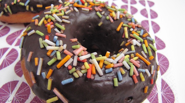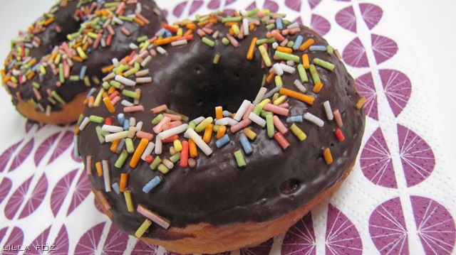 A kétféle lisztet összekevertem a sóval, a porélesztővel és a cukorral, először megolvasztom a mikróban a vajat, utána meglangyosítom a tejet, végül kicsit átmelegítem a lisztes keveréket. Az összes hozzávalót a liszthez adom, és pár perc alatt sima tésztává dagasztom. Konyharuhával letakarom, és meleg helyen a kétszeresére kelesztem. Lisztezett deszkán átgyúrom, 1,5 cm vastagra nyújtom, két pohárral (nekem a kicsi napolajos kupak volt ) gyűrűket szaggatok belőle, és konyharuhával lefedve még egy kicsit kelesztem. Egy mély fazékban jó sok olajat melegítek, és pár perc alatt megsütöm a fánkokat (először az eddig felfelé lévő oldalukat). közben csokoládét olvasztok, és a már megsült darabok tetejét megkenem csokoládéval, és megszórom színes cukorral.