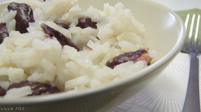 Az olajon megpárolom az apróra vágott hagymát, hozzáadom a rizst, átforgatom, majd hozzáadok két bögre vizet, elkeverem, lefedem, és kis lángon 15 percig főzöm. Közben leszűröm és átmosom a babot. A rizst megkóstolom, hogy megfőtt-e, megsózom, hozzákeverem a babot, 1-2 percig a tűzhelyen hagyom, hogy a bab átmelegedjen, majd tálalom.