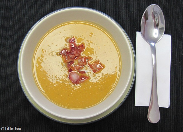 A tököt kikanalazom a héjából, és kicsit átforgatom az olvasztott vajon. Hozzáadom a lencsét, a tisztított fokhagymagerezdeket (egyben), átforgatom, majd felöntöm 3 bögrényi vízzel. Lefedem, 15 percig főzöm, majd összeturmixolom. Ha kell, adok hozzá még vizet, megsózom, kevés szerecsendióval ízesítem. Pár szelet bacont felaprítok, és ropogósra sütök. A forró levest a sült szalonnával a tetején tálalom.